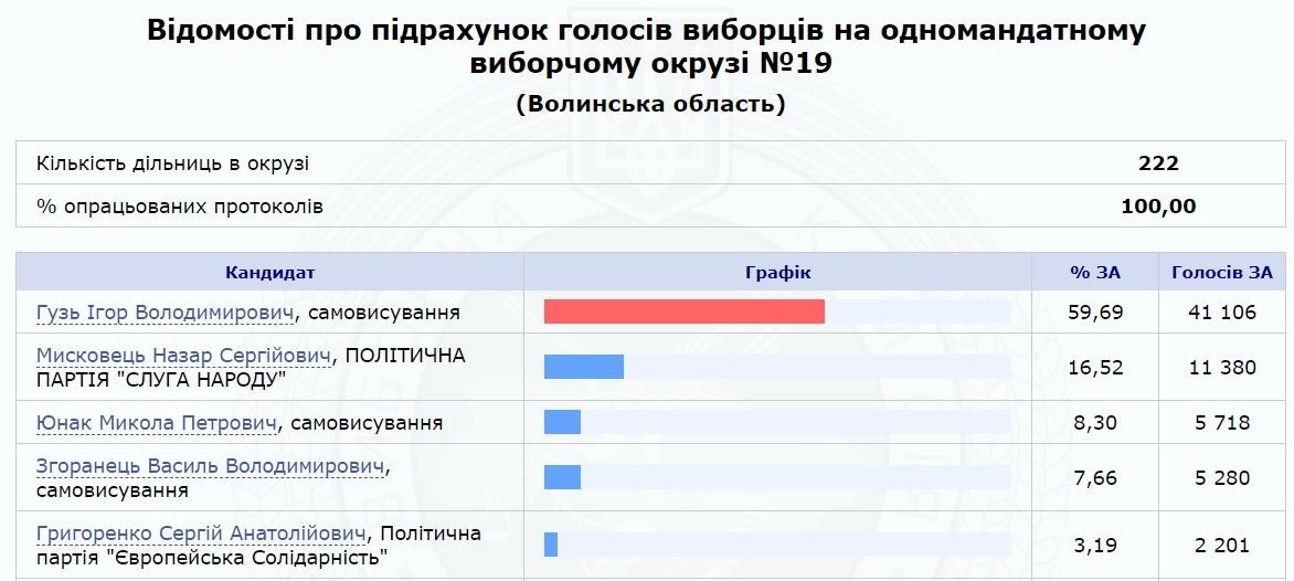 Так, за результатами підрахунків, у Верховну Раду від 19 округу проходить Ігор Гузь, який набрав 59,69%.