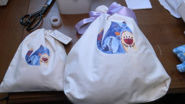 Зараз він займається кроєм, прасуванням і пакуванням виробів, його дружина конструює майбутні іграшки. Тетяна Жеребко розповіла: вони співпрацюють з дизайнерами-ілюстраторами, у яких купують макети. У пошитті орієнтуються на натуральні органічні тканини, щоб покупцям було приємно торкатися іграшки.