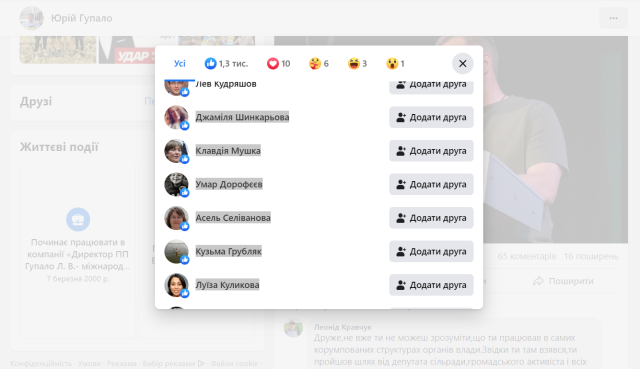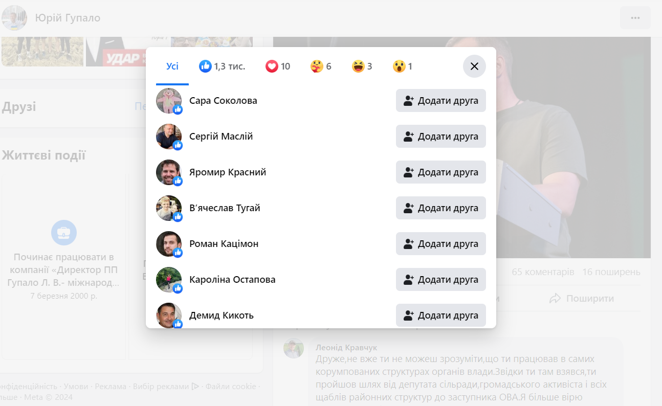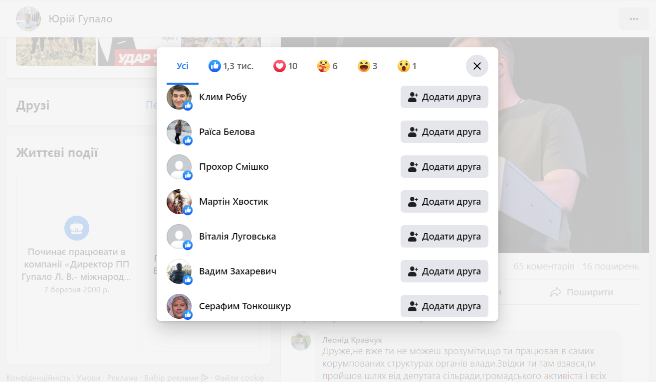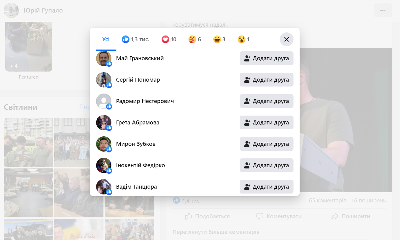 У своєму ж постій Юрій Гупало повідомив, що написав заяву на звільнення з посади, бо «для цього настав час». Він також звинуватив ТРК «Аверс» та ІА Волинські Новини у поширенні недостовірної інформації та маніпуляціях, пригрозивши судом. Звичайно, Юрій Гупало не міг не похвалитися своїми досягненнями за час роботи. А насамкінець написав про чесність та порядність.Але звідки він отримав таку підтримку в Facebook під цим постом у майже 1500 лайків? Це викликає обґрунтовані сумніви. Серед тих, хто лайкнув пост, є чимало користувачів з доволі дивними іменами: Джаміля Шинкарьова, Клавдія Мушка, Умар Дорофєєв, Асель Селіванова, Кузьма Грубляк, Луїза Куликова, Сара Соколова, Яромир Красний, Кароліна Остапова, Демид Кикоть, Май Грановський, Клим Робу, Мартін Хвостик, Серафим Тонкошкур, Прохор Смішко, Інокентій Федірко, Ільдар Гірник, Теона Обухова. І це просто добірка, адже користувачів з такими іменами значно більше, це лише їх показова частина. З повним списком профілів, які відреагували на допис, можна ознайомитись за посиланням.Заходимо на сторінки до декількох з них. Усі вони фактично однакові: одне фото, відсутність будь-якої інформації та друзів чи активності. Здебільшого створені вони у березні або ж вересні минулого року та що найдивніше – в однакові дні. Чи боти це? Сумнівів жодних.Дивним видається і той факт, що коментарі з резонними запитаннями до Юрія Гупала, які залишились без відповіді, зібрали більше вподобань, ніж коментарі підтримки.Заразом переглядаємо й інші пости Юрія Гупала, на них – переважно від 30 до 100 лайків.Чи вирішив Гупало таким чином зімітувати підтримку, чи, може, це був такий оригінальний подарунок на день народження, який він відзначав наступного дня – невідомо. Проте вийшло, як у старому анекдоті. «Мамо, нас люди хвалять!» – «Хто, доню?» – «Я – тебе, а ти – мене».