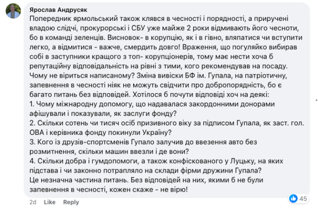 Скандальний ексзаступник голови Волинської обласної військової адміністрації Юрій Гупало після звільнення з посади написав пост-прощання у Facebook, в якому звинуватив журналістів ТРК "Аверс" та Інформаційного агентства Волинські Новини у поширенні нібито неправдивої інформації про його роботу. Натомість ні словом не обмовився про розслідування журналіста "Української правди" Михайла Ткача, який розповів, що за 7 тисяч доларів через Фонд Гупала за кордон пропускали чоловіків призовного віку.
