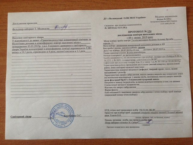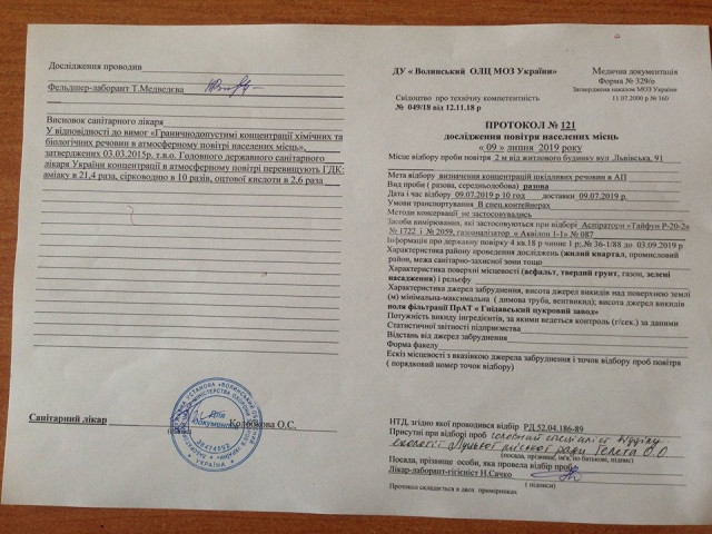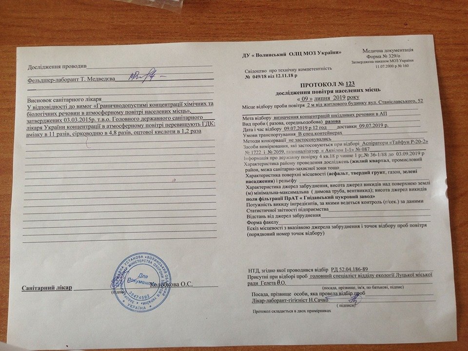 9 липня, на замовлення Луцької міської ради, проведено лабораторні дослідження якісного стану атмосферного повітря. У всіх пробах зафіксовано факт перевищення гранично-допустимої концентрації за аміаком, сірководнем, оцтовою кислотою.