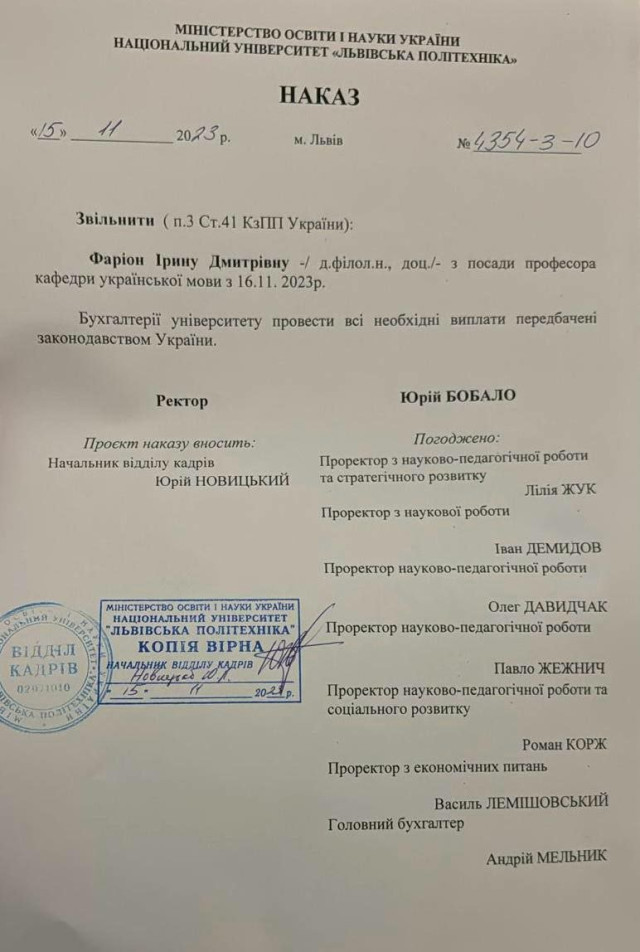 Ірину Фаріон звільнили з «Львівської політехніки»