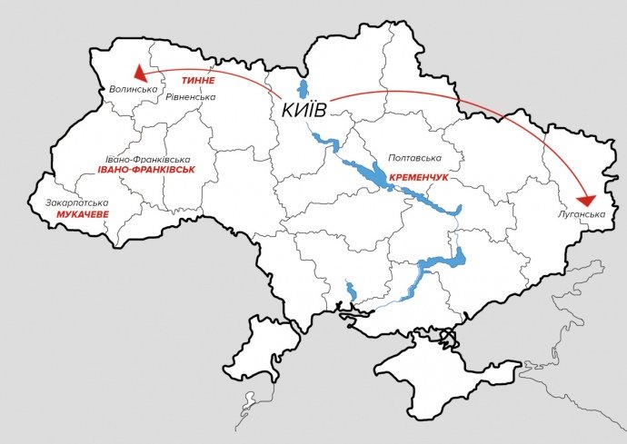 Червоним на карті позначені назви міст, у яких виявили перших хворих у регіонах (наприклад, Кременчук – Полтавська). Стрілками – повернення хворих (Луганщина) та можливе перенесення інфекції (Волинь) з Києва