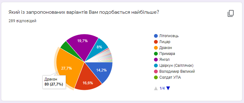 У рамках підготовки було проведено опитування, в якому взяли участь 289 мешканців. Із них 64,9% – жінки, а 35,1% – чоловіки. За його результатами, 65,5% респондентів вказали, що їм до вподоби персонаж містичного або казкового характеру. Так, отримавши 80 голосів, що становить 27,7% від загальної кількості відповідей, переможним став варіант «Дракон».