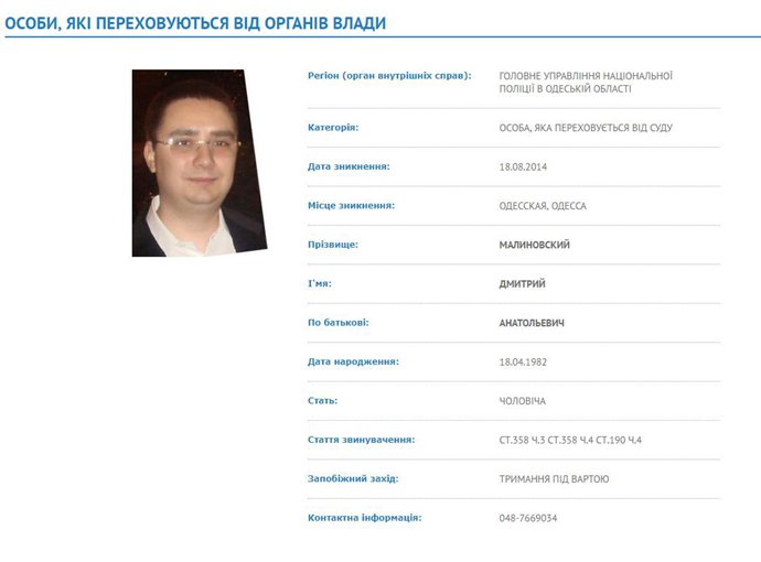 Малиновського спочатку взяли під варту, а потім змінили арешт на півмільйона застави. Але менш ніж за рік чоловік перестав з’являтися до суду, через що в серпні 2014 року його оголосили у розшук.