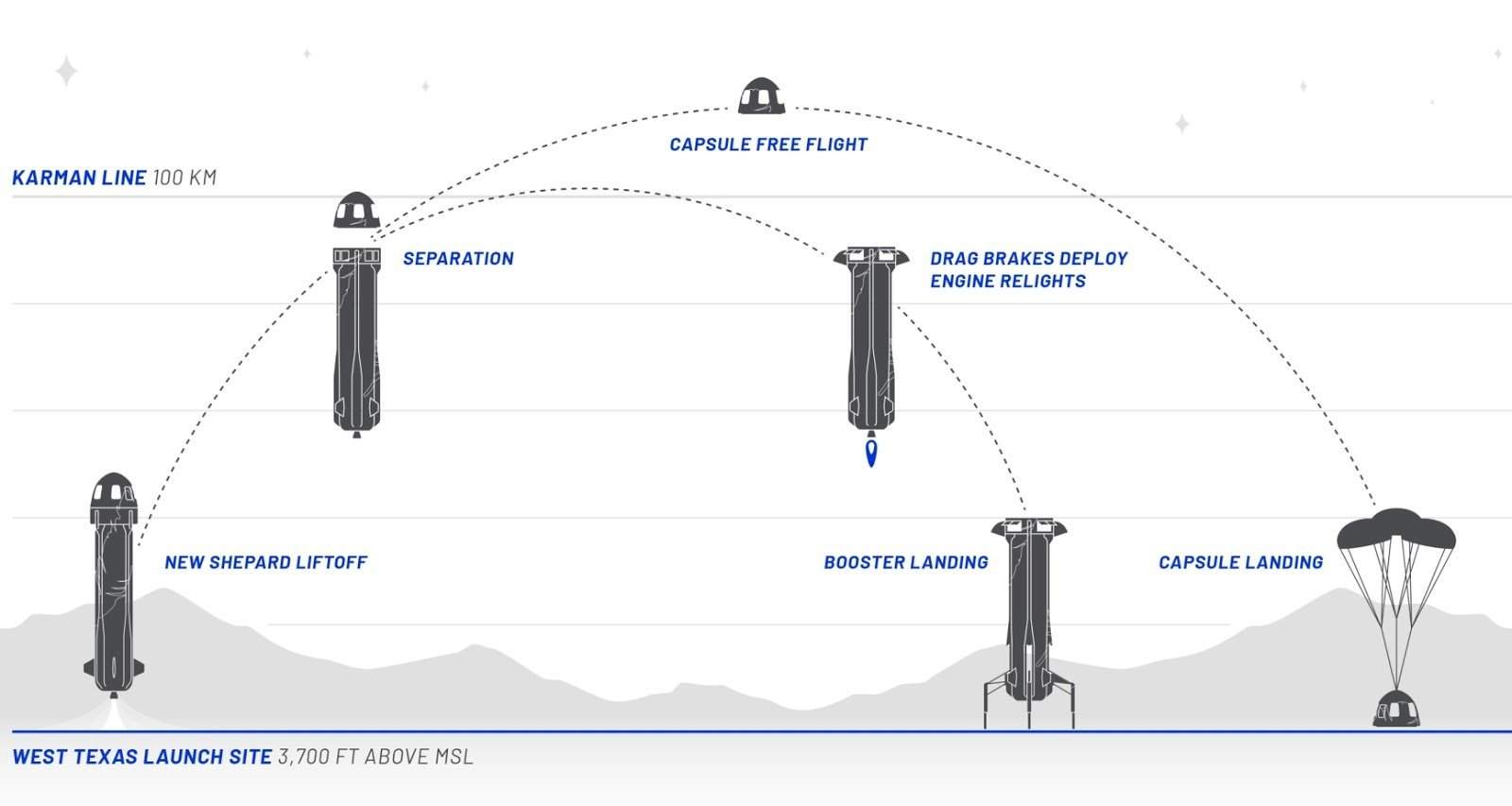 Пасажири приблизно 4 хвилини перебували у невагомості, а під час польоту вони витримали перевантаження у 3 g, а при посадці – 5,5 g.Схема польоту New Shepard / Фото Blue Origin