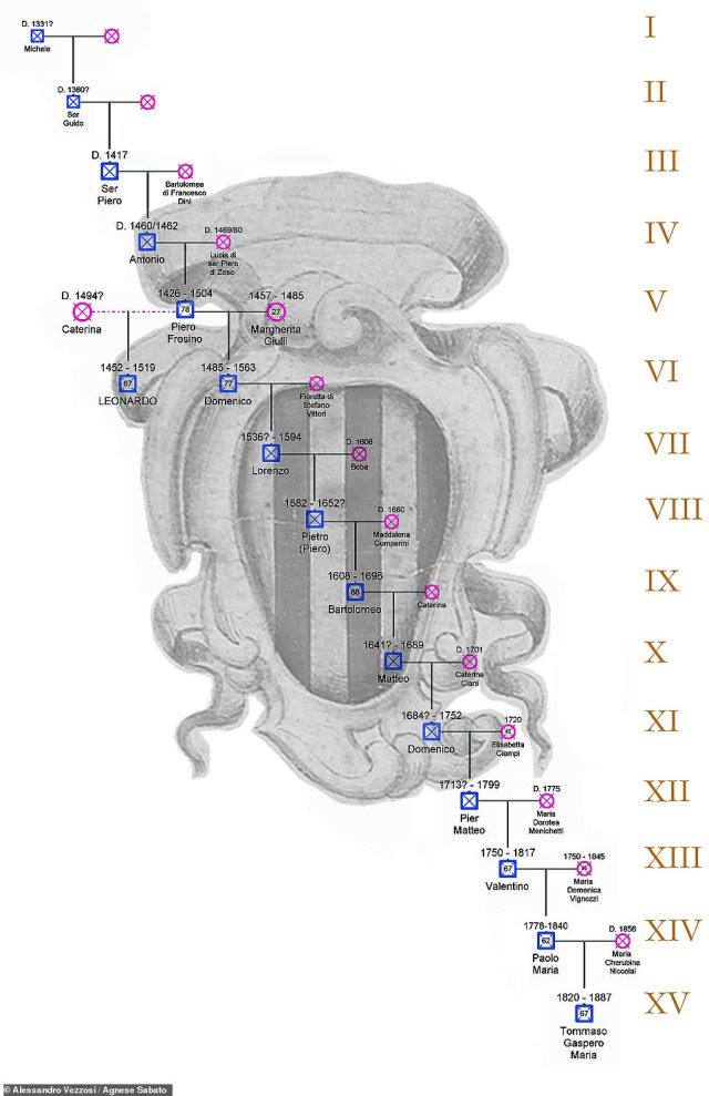 Історія почалася з Мікеле (який народився в 1331 році) і охопило п’ять сімейних гілок, в тому числі ту, яка привела до його пра-пра-правнука Леонардо (який народився 1452 року).До 15-го покоління сім'ї дослідники зібрали дані про понад 225 різних осіб, які становлять генеалогічне дерево да Вінчі.Серед 14 живих нащадків — фермери, офісні працівники, шпалерник, продавець порцеляни і навіть художник, які кажуть, що пишаються спорідненістю з великою людиною.