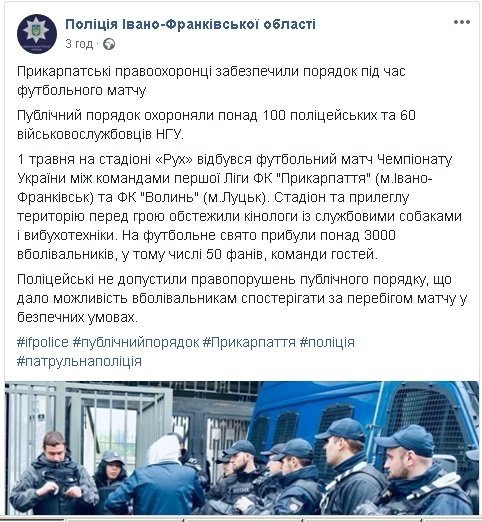 «Рота ТОР управління патрульної поліції в Івано-Франківській області відповідно до Закону України «Про Національну поліцію» подбала про забезпечення публічної безпеки під час футбольного матчу «Прикарпаття» - «Волинь» на міському центральному стадіоні «Рух».
