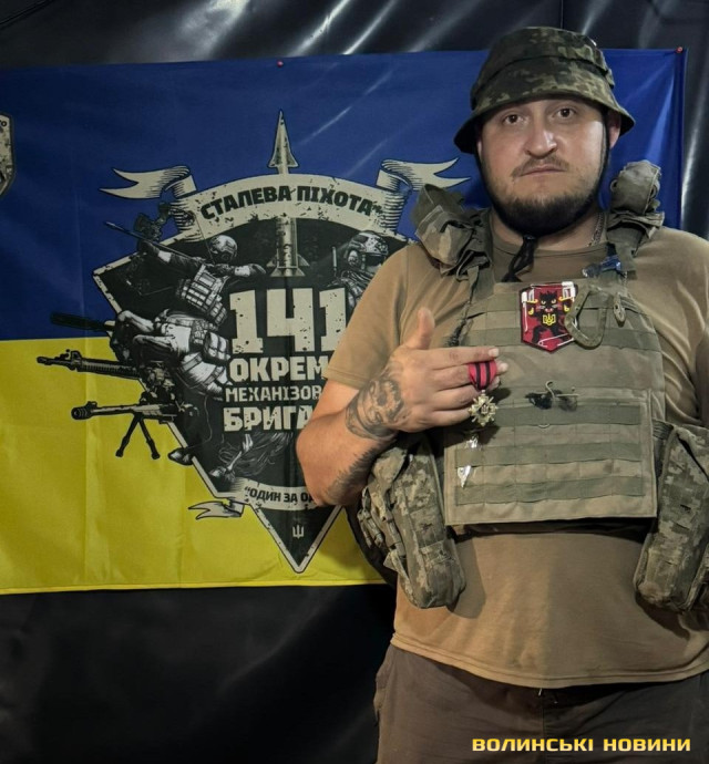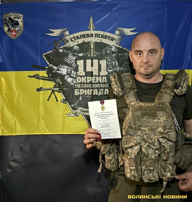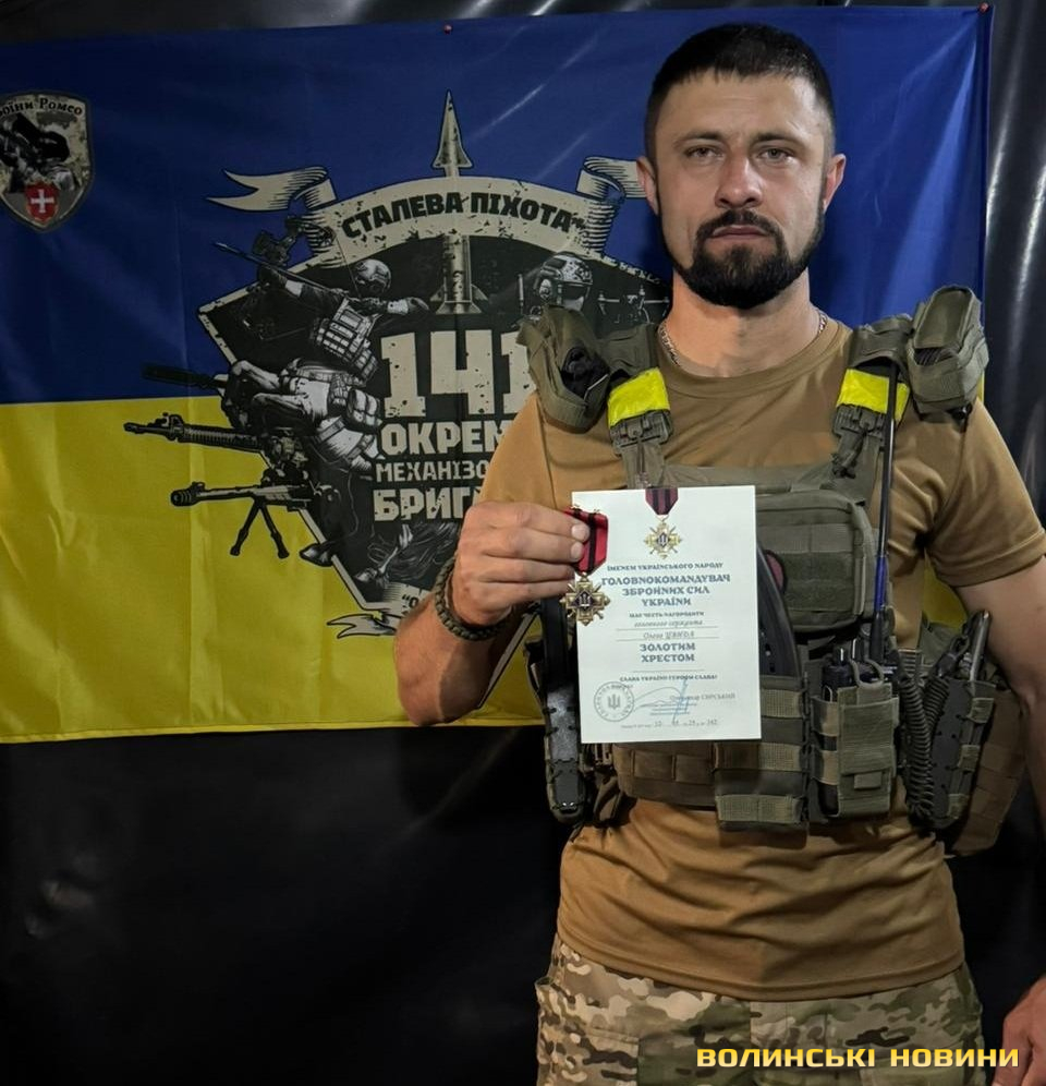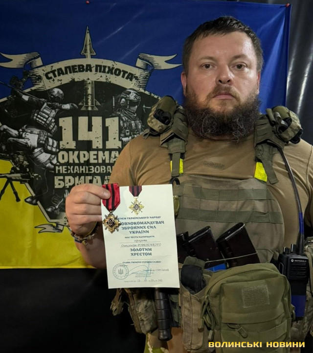 Солдат Валентин «Махно» Калюх у військо потрапив у 2023 році. Особливо відзначився в лютому 2025-го. Під час одного з ворожих штурмів захисник знищував FPV-дрони противника, тим самим забезпечуючи відхід поранених із сусідніх позицій. Уже наступного дня чоловік теж брав участь в операції з евакуації засобів ППО, вражаючи російські безпілотники. На жаль, зараз Валентина Калюха вважають зниклим безвісти.Чотирьох бійців підрозділу «Воїни Ромео» нагороджено нагрудним знаком «Золотий хрест».