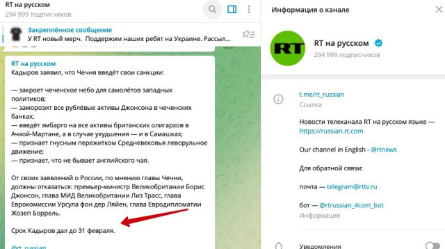 Прем’єр-міністр Великобританії Борис Джонсон, глава МЗС Великобританії Ліз Трасс, голова Єврокомісії Урсула фон дер Ляєн і голова європейської дипломатії Жозеп Боррель повинні відмовитися від своїх заяв щодо санкцій проти Росії через військову операцію в Україні «до 31 февраля», інакше Чечня застосує проти них заходи у відповідь. Таку заяву зробив глава республіки Рамзан Кадиров у своєму Telegram-каналі.