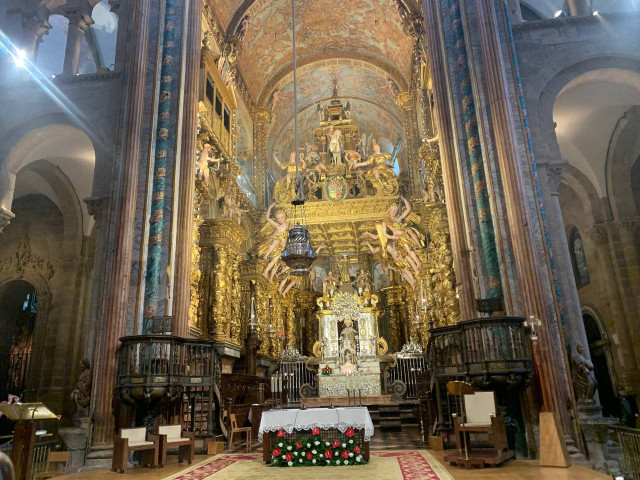 Я не знала, що це буде якраз того дня, у час, коли я буду там. Ще на початку подорожі мені про це розповів один нідерландець. Але, чесно кажучи, не думала, що мені так пощастить. Я прийшла у Сантьяго-де-Компостела в неділю, вирішила подивитися, коли служба відбувається. Бачу: є на 9:30 і на 12:00. От я надумала на 12 піти, бо ще хотіла зайти забрати той документ. Але впоралася швидше, ніж планувала.І близько 10-ї години я була біля собору. Туди з рюкзаками не пускають, тож підійшла до охоронця спитати, де можна буде залишити наплічник, щоб уже перед службою орієнтуватися. Але охоронець мене пропустив, сказавши, що в мене рюкзак невеликий, тому можу пройти.