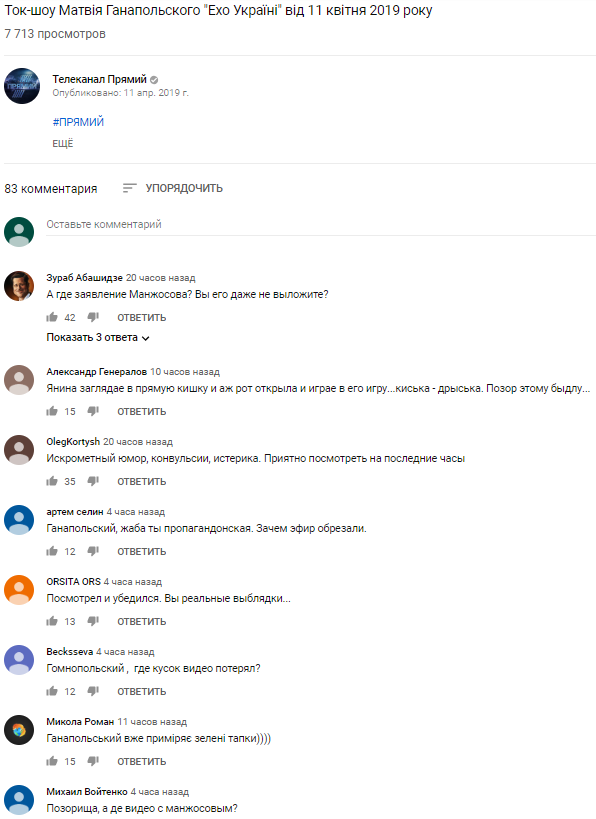 На це звернула увагу блогер Ольга Шарій. Також під самим відео користувачі YouTube залишили безліч коментарів з питаннями, чому фрагмента з Манжосовим немає в записі шоу. Відзначимо, телеканал «Прямий» пов’язують з Петром Порошенком, чий штаб активно поширює чутки про нібито наркозалежності Зеленського.У своєму виступі у відповідь на питання Ганапольского Манжосов заявив, що Зеленський не вживає наркотики.
