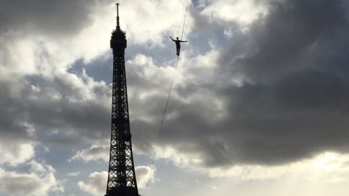 Трюкач Натан Полін влаштував видовище для парижан і гостей міста – у суботу він протягом 30 хвилин йшов по довгому канату на 70-метровій висоті.