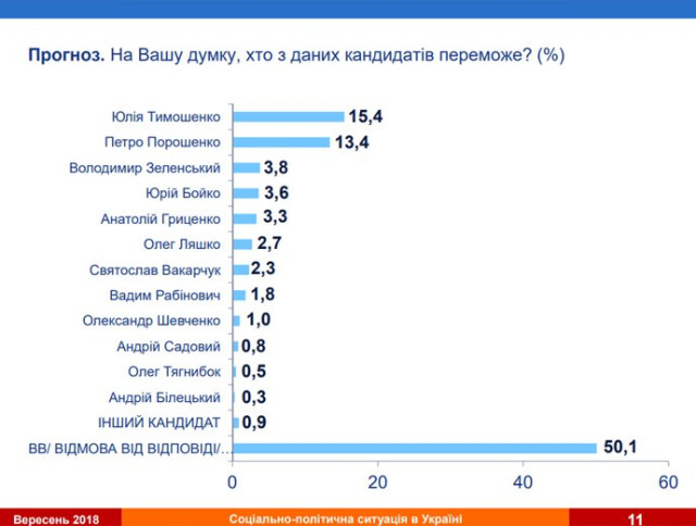 При цьому аж 27,5% опитаних відмовилися відповідати на запитання, або сказали, що не знають, за кого голосуватимуть.15,4% опитаних прогнозують, що на виборах переможе Юлія Тимошенко, 13,4% вірять, що всидить у кріслі Петро Порошенко. У інших кандидатів, на думку опитаних, немає шансів перемогти цих двох.