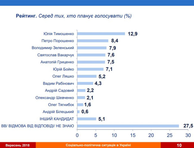 12,9% опитаних (серед тих, хто планує голосувати) готові віддати свій голос за Юлію Тимошенко. Разом з нею у другий тур виборів можуть пройти ще 6 кандидатів – Петро Порошенко, Володимир Зеленський, Святослав Вакарчук, Анатолiй Гриценко та Юрій Бойко. За них готові проголосувати 7,1-8,4% (зважаючи, що похибка дослідження становить 1%).