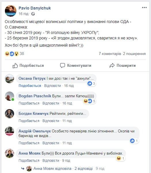 «Хоч бої були в цій швидкоплинній війні?» – іронізує депутат.У відповідь журналістка Оксана Петрук зазначає, що волиняни досі «не ахнули», як це обіцяв Олександр Савченко.