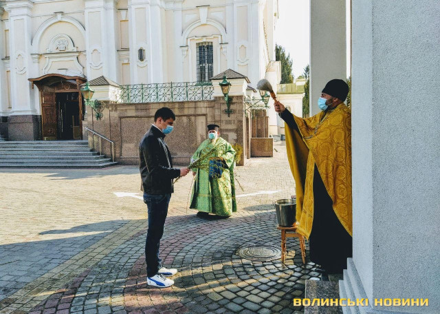 При вході людей зустрічає священник, який нагадує про необхідність носити маску та дотримуватися дистанції. Також на церковному подвір'ї інший священник здійснює символічне побиття вербовою лозою. Він теж нагадує про необхідність дотримуватися дистанції. Усередині храму також все за правилами: людей не багато, між ними є необхідна дистанція.Як сказав один із священників, «ми просимо людей потерпіти. Все проходить і це також пройде. Головне - бути здоровими та живими».