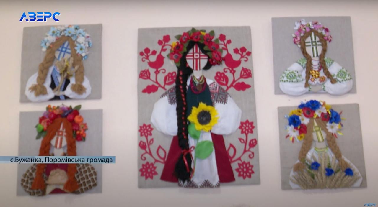 Відвідувачки гуртка і керівниця з гордістю показують першу спільну роботу. Це соняшник, кожна пелюстка якого символізує Україну. Також учениці демонструють ляльки-мотанки, які уособлюють пори року. Це теж колективна робота.