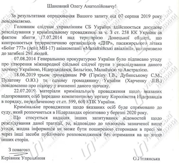 «22.07.2019 матеріали кримінального провадження щодо зазначених підозрюваних передані компетентному органу Королівства Нідерланди... Кримінальне провадження щодо зазначених осіб буде направлено в суд, який почнеться в Нідерландах орієнтовно в березні 2020 року», – зазначено у відповіді на запит.Однак, в СБУ відмовилася надати відповідь про те, чи обрано підозрюваним запобіжні заходи і чи оголошено їх в розшук. В органі підкреслили, що згідно з угодою про створення міжнародної слідчої групи, ніяка інформація не може бути оприлюднена в пресі без згоди інших сторін угоди.