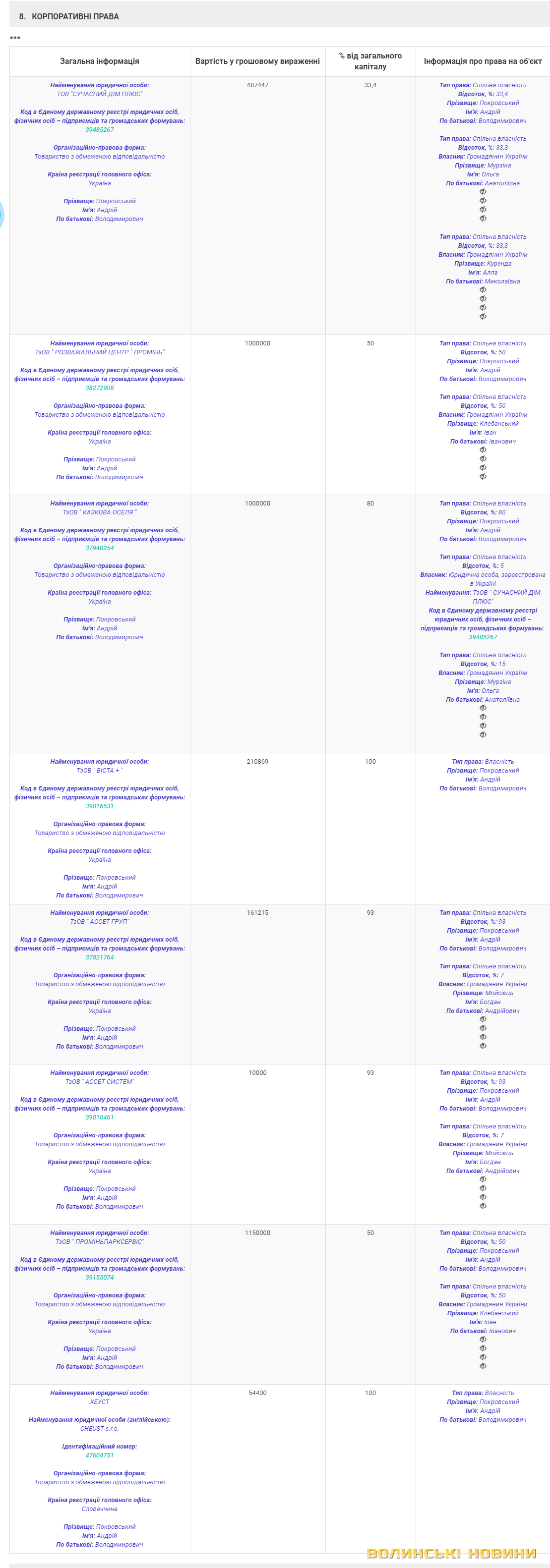 Андрій Покровський є одним із засновників ТзОВ «Сучасний дім плюс» (це підприємство – серед засновників ТзОВ «Казкова оселя», яке теж пов’язане з Андрієм Покровським та Ольгою Мурзіною).