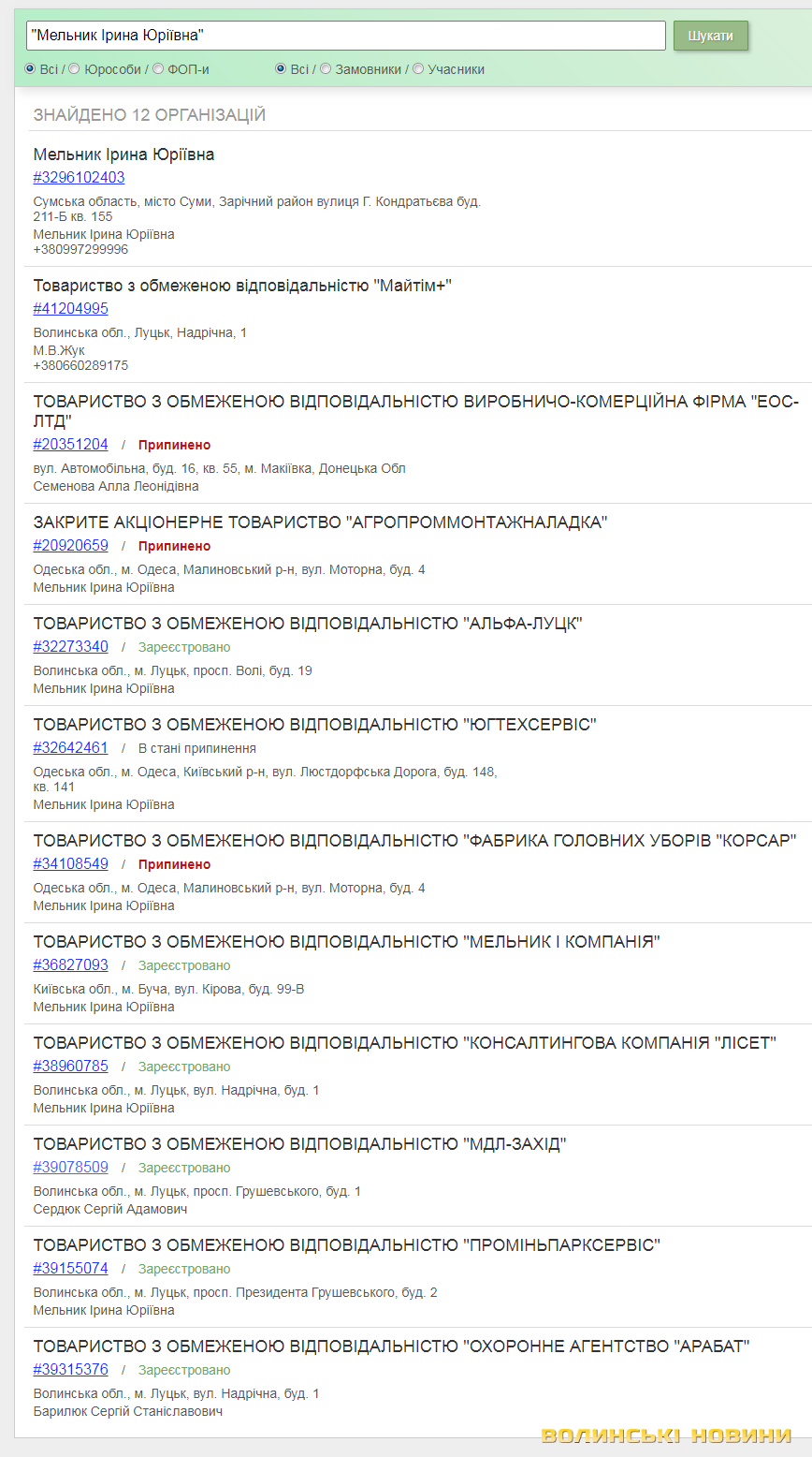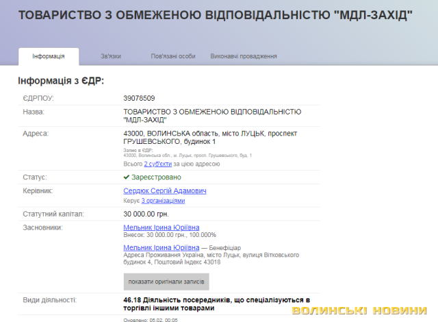Давайте по-порядку. Згідно з даними реєстрів, ТОВ «МДЛ Захід» займається «діяльністю посередників, що спеціалізуються в торгівлі іншими товарами». Власником, а точніше, власницею цього підприємства є Мельник Ірина Юріївна. Вона – керівник, засновник і бенефіціар цілої низки фірм. Зокрема, вона керує ТзОВ «Проміньпарксервіс», власником якого є Андрій Покровський. Також вона директор ТзОВ «Консалтингова компанія «Лісет», власницею якої є колишня дружина Андрія Покровського Ольга Мурзіна і де, згідно з декларацією депутата, працює і отримує зарплату він сам.Про те, що цей зв’язок випадковий, можна було б говорити, якби він існував лише між згаданими підприємствами і тільки цими особами. Та далі – більше.