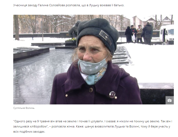 А кількома роками раніше, у 2021-му, під час вшанування загиблих, які полягли за визволення Луцька від нацистських загарбників, Галина Соловйова давала коментар одному з місцевих ЗМІ.«Одного разу на 9 травня він впав на землю і почав її цілувати. І сказав: я ніколи не покину цю землю. Так він і залишився хліборобом», – розповідала жінка, додаючи, що шанує визволителів Луцька та Волині, тому й бере участь у всіх подібних заходах.