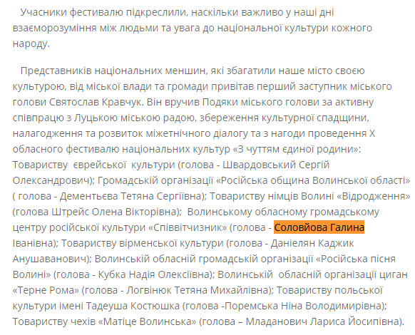Цього ж року Галина Соловйова була цитована і в нашому матеріалі «Заяви про утиски росіян на Волині – провокація». Жінка відзначала, що заява про утиски росіян в Луцьку не відповідає дійсності. Вона казала, що любить місто та державу. У цьому ж таки матеріалі йдеться про те, що вона була депутатом міської ради.
