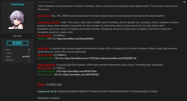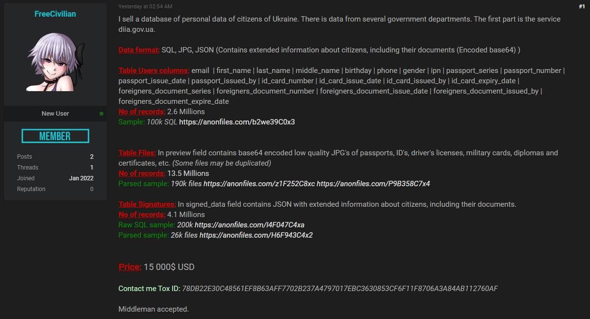 У ніч проти 22 січня невідомий виклав на хакерському форумі Raid forum оголошення про продаж нібито персональних даних українців, отриманих під час кібератаки 14 січня на державні сайти України.
