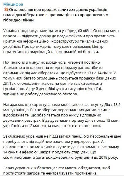 «Оголошення про можливість купити дані, отримані після зламу 14 січня, є аферою: шахраї продають старі дані, що скомплектовані з багатьох джерел, які були злиті до 2019 року», – заявили у міністерстві.