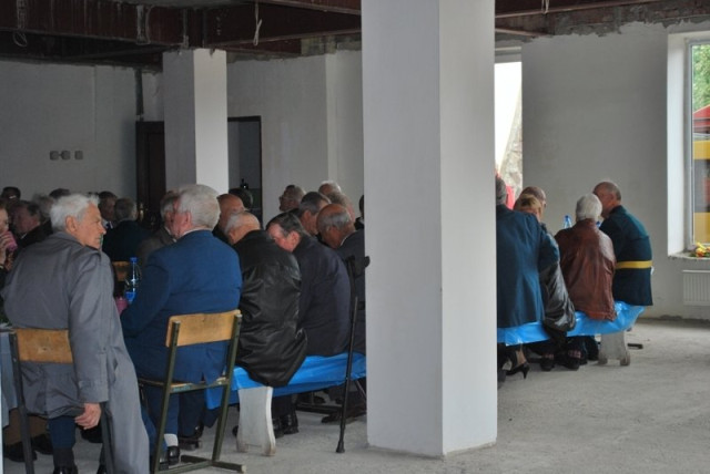 Ветерани сиділи в очікувані у недобудованому приміщені стадіону. Інші мешканці міста біля столу з одноразовим посудом.