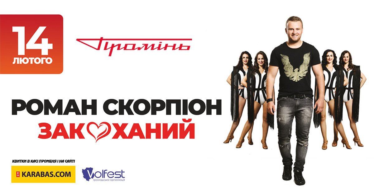 У рамках всеукраїнського туру виконавець та автор хiтiв «Поцiлую», «Фата», «Так Сильно» Роман Скорпіон дасть концерт у Луцьку. Виступ відбудеться у День закоханих, 14 лютого, о 19.00 у РЦ «Промінь».
