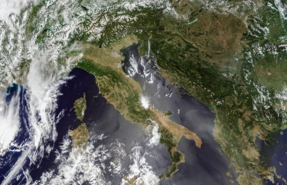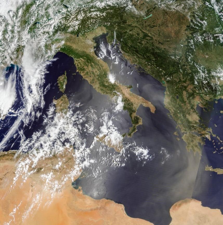Щільна хмара пилу з Сахари рухається над Середземним морем до Італії та Південно-Східної Європи.