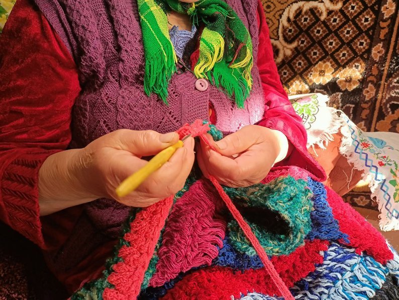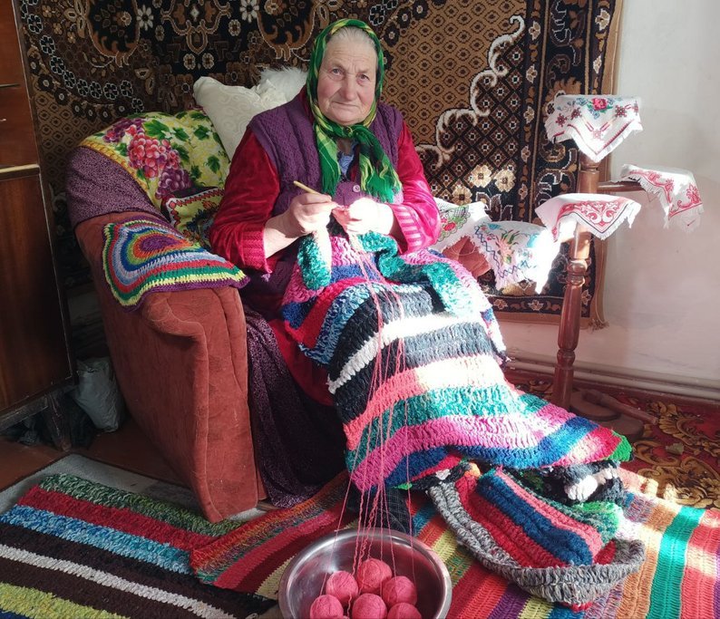 Ниток на килимки йде багато. Онуки і соцпрацівники приносять жінці старі светри, які вона розпускає і перетворює у різнобарвні килими.В'язати килими, каже пенсіонерка, її ніхто не вчив.