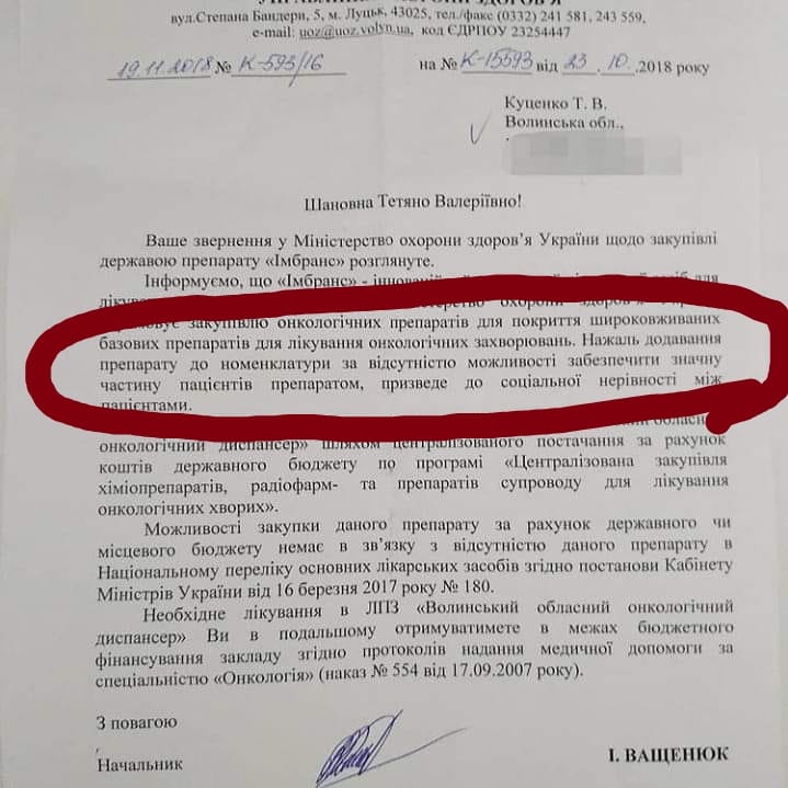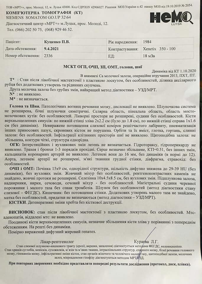 «У мене рак молочної залози 4 стадії з 2018 року. Веду збір коштів на дороговартісні ліки, ціна в середньому 35000 грн в місяць. Препарат, який стримує розвиток хвороби, – таргет «Ibrance» виробника Pfeizer. Міністерство охорони здоров’я повідомило, що не буде мені особисто закуповувати цей препарат, бо це приведе до соціальної нерівності серед таких хворих, як я, не дивлячись на те, що він мені допомагає і я живу. Вже на сьогодні 33 курс іде. Вірю, що все-таки знайдуться люди і допоможуть мені придбати наступну упаковку ліків, щоб жити, просто жити і бачити рідних! На 34 курс потрібно 35000 грн. Хочу нагадати, по 5 пухлин було в печінці і легенях. Препарат реально допомагає», – звертається Тетяна Куценко.