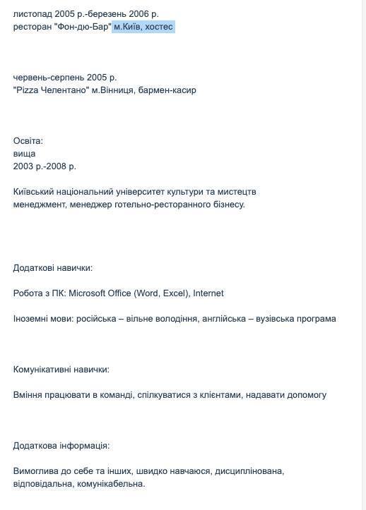 Давайте включимо критичне мислення. В анкеті вказано, що працювала хостес 15 років назад, а саме під час навчання в університеті. Не бачу нічого поганого, що працювала , а не сиділа на шиї батьків. Мене більше цікавить, де працювала останні 5-7 років.