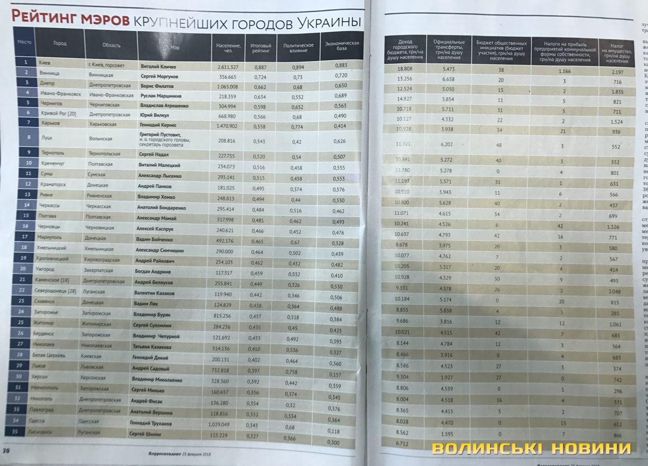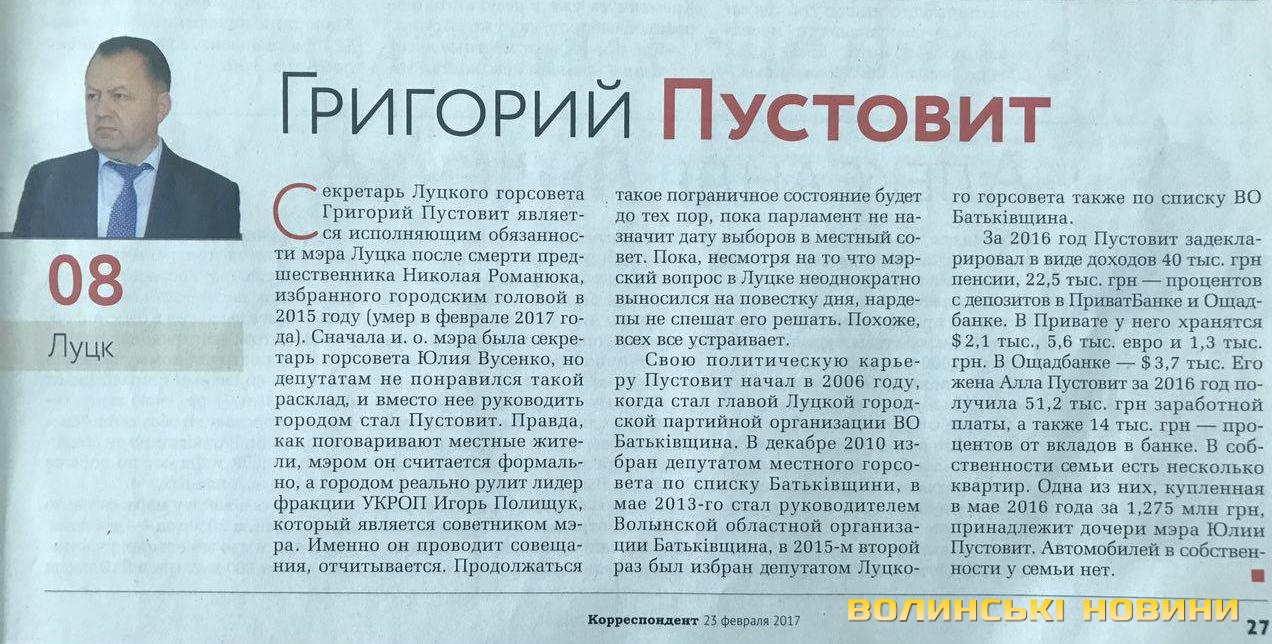 У рейтингу впливовості мерів українських міст, за підрахунками журналу «Кореспондент», виконувач обов'язків Луцького міського голови Григорій Пустовіт посів восьму сходинку.