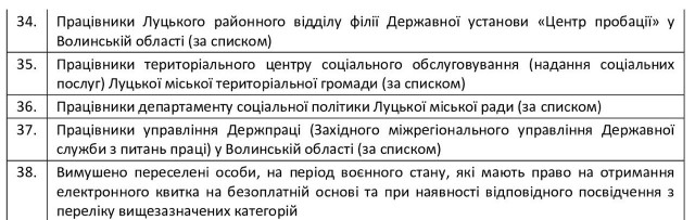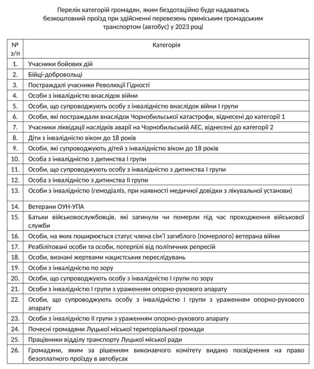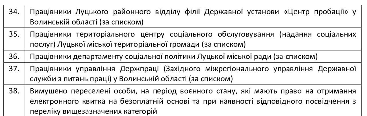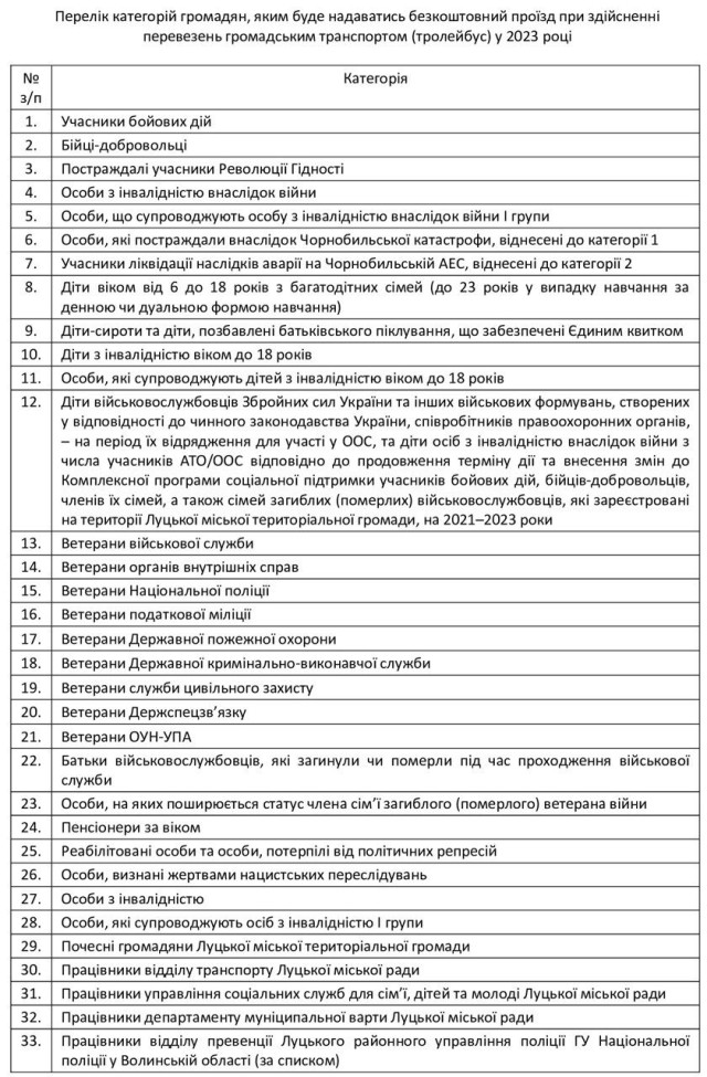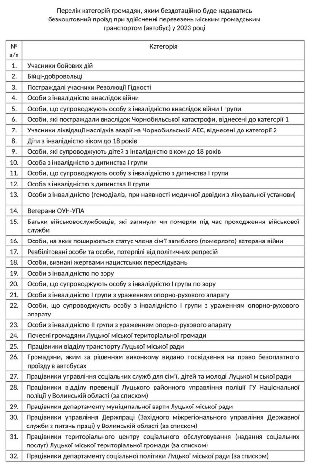 Було затверджено перелік громадян, зареєстрованих у Луцьку та інших населених пунктах громади, яким надаватиметься безплатний проїзд. Умова – пред’явлення відповідного посвідчення та електронного квитка.