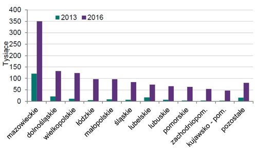 Характерно, що ще у 2013 році більше половини (56%) українських робітників працювали у Мазовецькому воєводстві (включає Варшаву). За результатами ж 2016 року частка столичного регіону впала до 28%. Натомість українці частіше працюють в інших воєводствах.