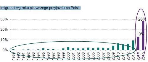 Особливістю ж останніх трьох років стала поява нових мігрантів. 41,3% приїхали до Польщі вперше у 2014 році або пізніше. Більше того, дослідження показують зростання відсотка людей, що вперше приїздять на роботу в цю країну.