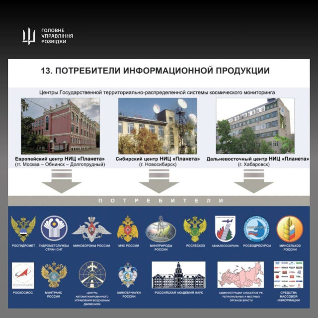 «Вказане російське державне підприємство федерального рівня спеціалізується на прийманні та обробці даних із супутників, а також забезпечує відповідною продукцією понад 50 державних суб’єктів: передусім – міністерство війни, генеральний штаб та служби МНС РФ», – йдеться в повідомленні.