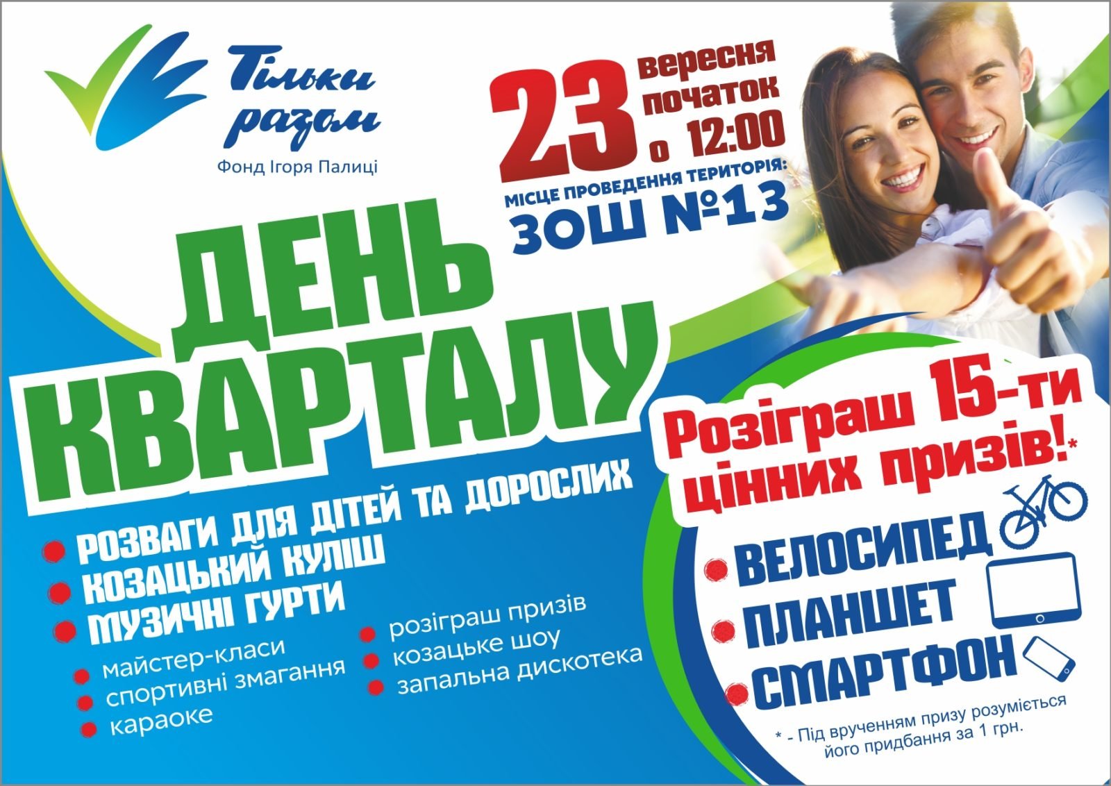 Насичена програма передбачає цікавинки як для дітей, так і дорослих. Захід організовує та фінансує Фонд Ігоря Палиці «Тільки разом». Початок о 12:00, повідомили у прес-службі Фонду.