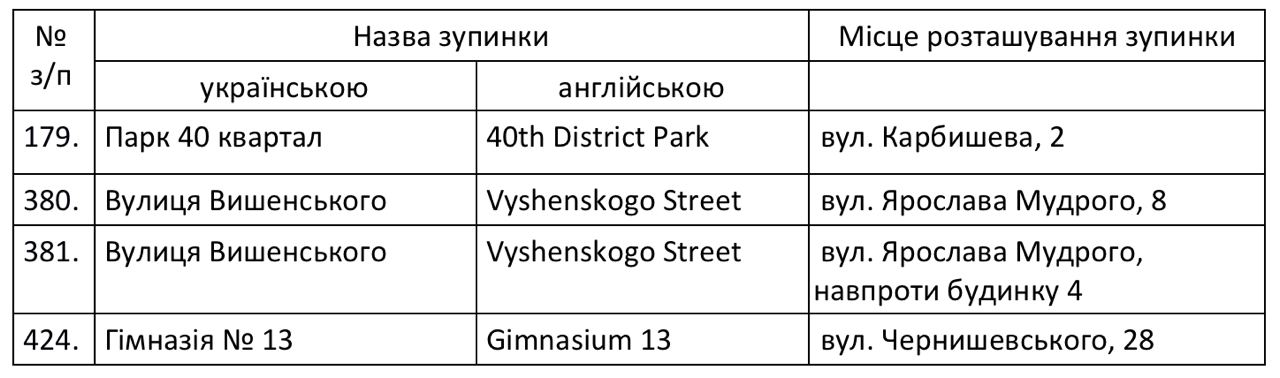 Також буде змінено місце розташування двох зупинок «Вулиця Вишенського» з вулиці Ярослава Мудрого, 2в на вулицю Ярослава Мудрого, 8 та з вулиці Ярослава Мудрого навпроти будинку №2в на вулицю Ярослава Мудрого навпроти будинку №4.
