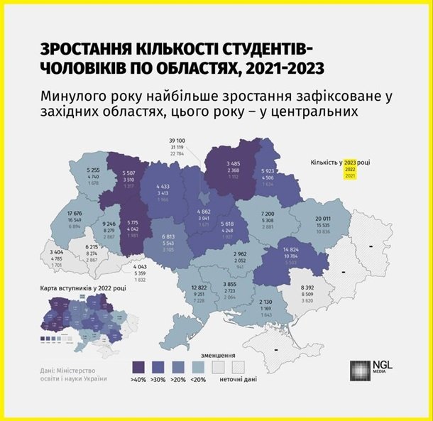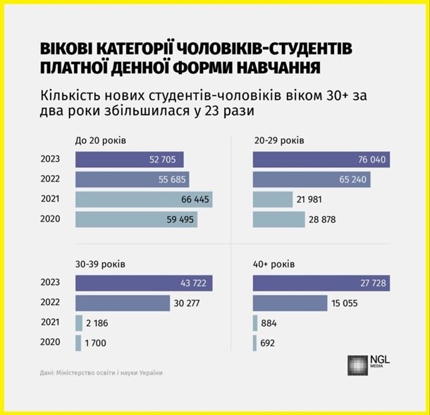 Як свідчить аналіз NGL.media, цього року у ЗВО на платне денне навчання вступили 71 тисяча чоловіків від 30 років, у тому числі майже 23 тисячі з них пішли на нижчий чи той же освітній рівень, який уже мали.