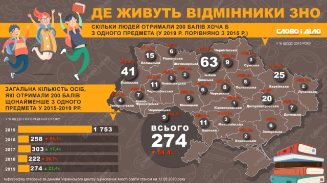 За п’ять років кількість тих, хто склав ЗНО на 200 балів, зменшилася з 1 тис. 753 до 274 осіб. На Волині у 2019 році лише 15 осіб отримали максимальну кількість балів, що на 64,3% менше, ніж було 2015-го. Проте волиняни входять до десятки найкращих в Україні.