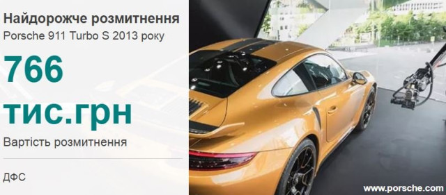 Найдорожчою розмитненою машиною став Porsсhe 911 Turbo S 2013 року із заявленою вартістю 83 тисячі доларів, за яку власник сплатив 766 тисяч гривень податків.У трійці лідерів також Porsсhe Cayenne S, за яку сплатили 705 тисяч гривень податків, та MERCEDES-BENZ G CLASSE зі сплаченими 593 тисячами гривень.