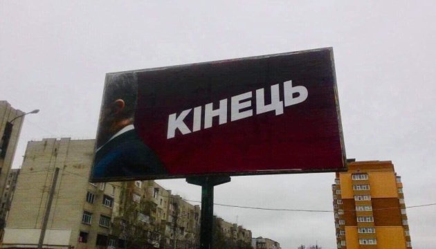У низці українських міст у неділю, 14 квітня, почали з’являтися нові рекламні борди, схожі за стилістикою на передвиборчу кампанію чинного президента Петра Порошенка, з написом «Кінець».