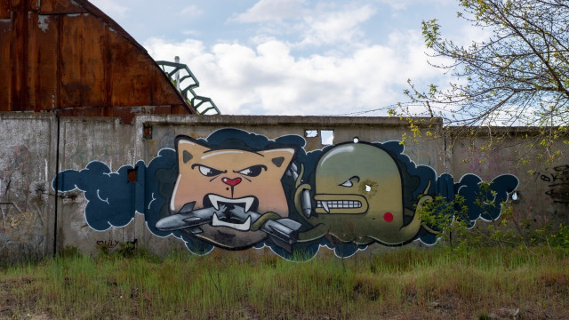 «Ми обоє малюємо графіті, тому вирішили зробити таку роботу. Він давно працює з такими персонажами, як риби, а я в одному зі своїх проєктів малюю котів. Ми вирішили намалювати графіті у Бучі, Ірпені чи Гостомелі – ці міста фактично є одним цілим. Станіслав показав різні локації, мені сподобалася локація біля річки. А концепція виникла на ходу. Середовище саме диктувало тематику. Робота присвячена подіям в Україні. Ми обрали саме такий образ», – поділився Андрій Присяжнюк.Співавтор Станіслав Видиборець, який родом з Луцька, а зараз проживає в Гостомелі під Києвом, присвятив роботу своєму брату і його побратимам, які нині захищають Україну в складі сил ППО.