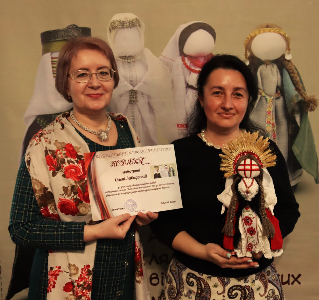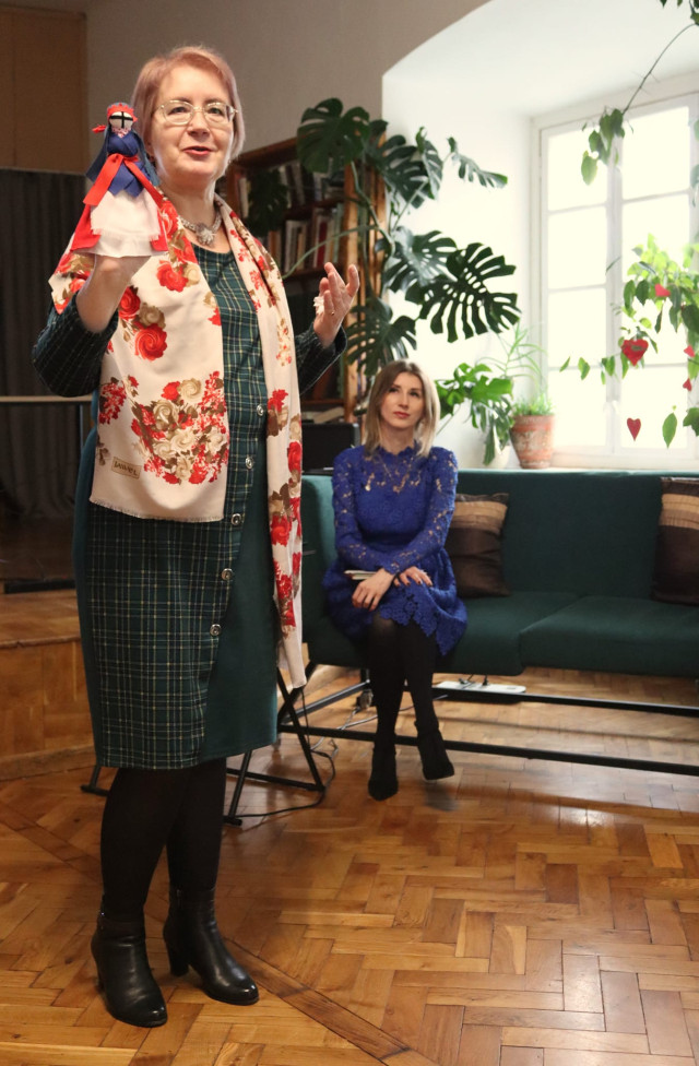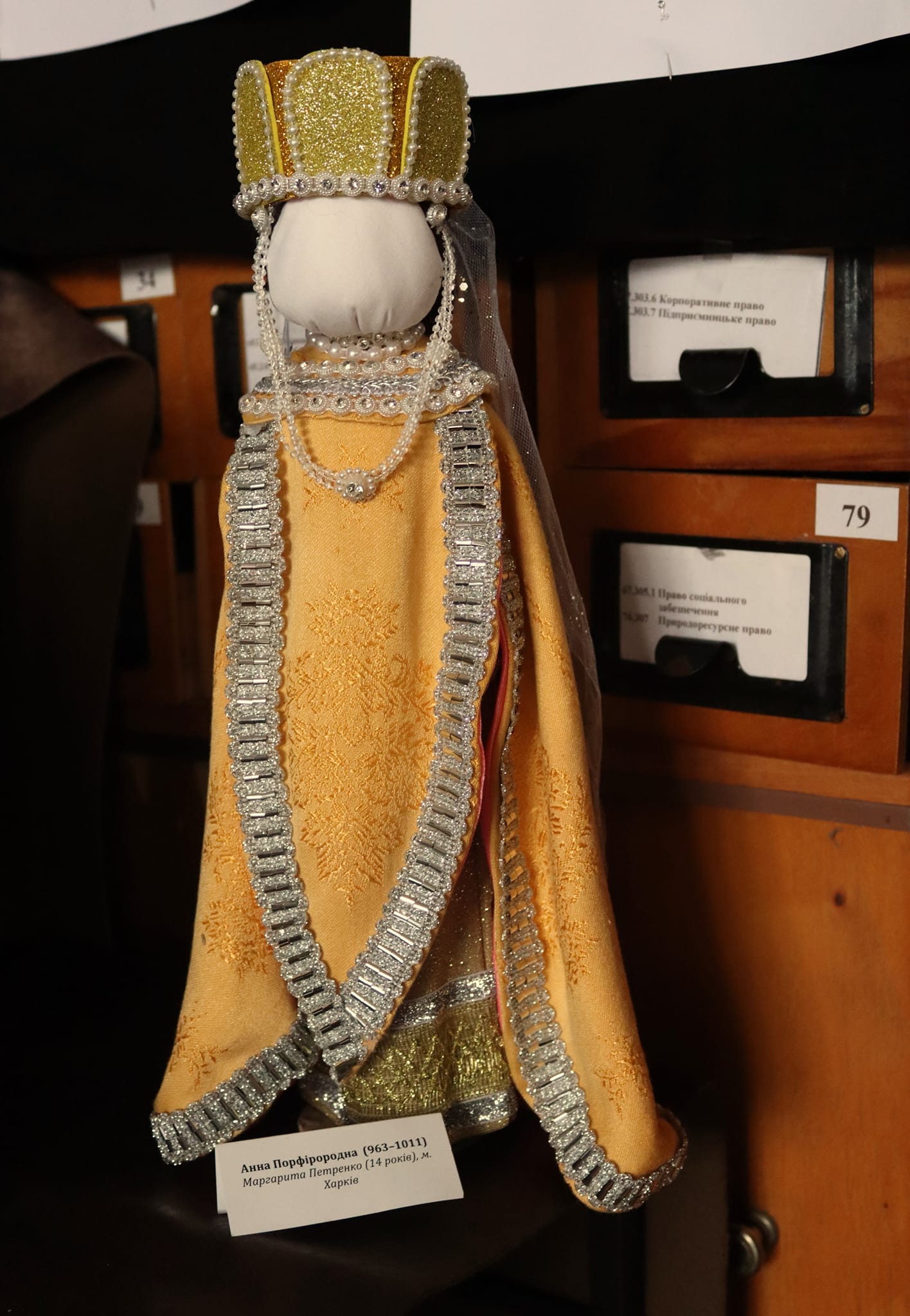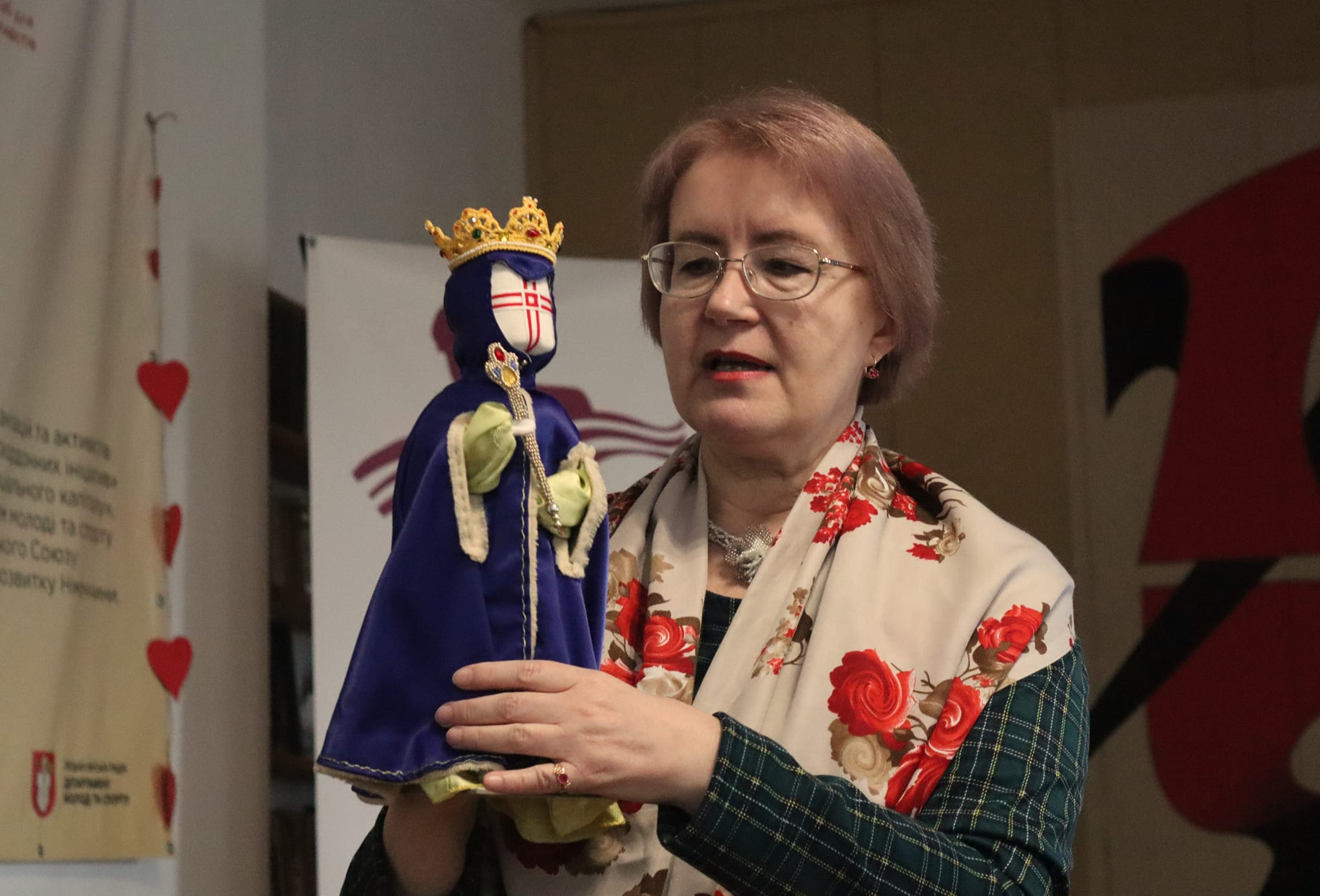 Розповіла про історію виникнення ляльки, її види, традиції творення, різницю між мотанкою та вузловою лялькою луцька майстриня-лялькарка Олена Михальчук, чиї роботи теж представлені в експозиції.Варто зазначити, що на виставці зараз загалом 79 вузлових ляльок, що вбрані у княжі строї часів Київської Русі. Вони виконані не як історичні копії, а як стилізовані образи, засновані на власних дослідженнях українських майстринь-лялькарок.Присутнім волонтерам, студентам та викладачам Технічного фахового коледжу ЛНТУ і ЛЦПТО та іншим гостям було дуже цікаво дізнатись історію кожної княгині та князівни, які зараз перебувають у книгозбірні.Читати ще: Волинський майстер виготовив ляльку-мотанку з гусячих яєць