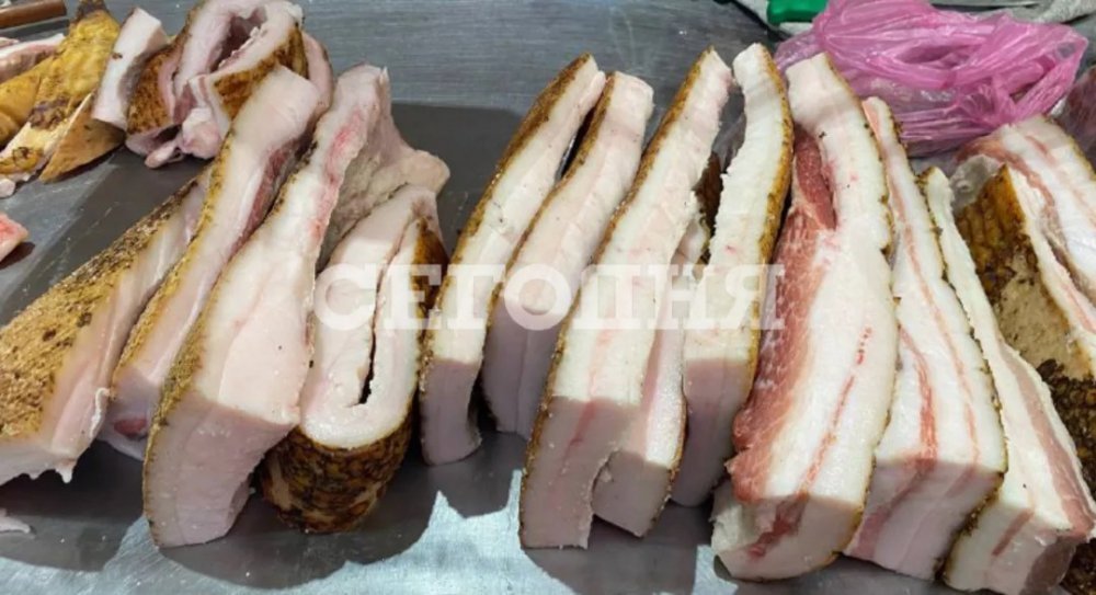Жінки показали шматки сала. Ціни коливаються від 150 до 500 грн за кілограм. Тищенко, кажуть продавчині, купує український делікатес по 250 грн.