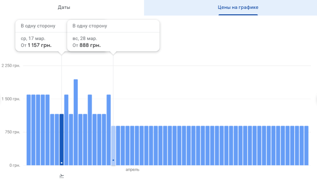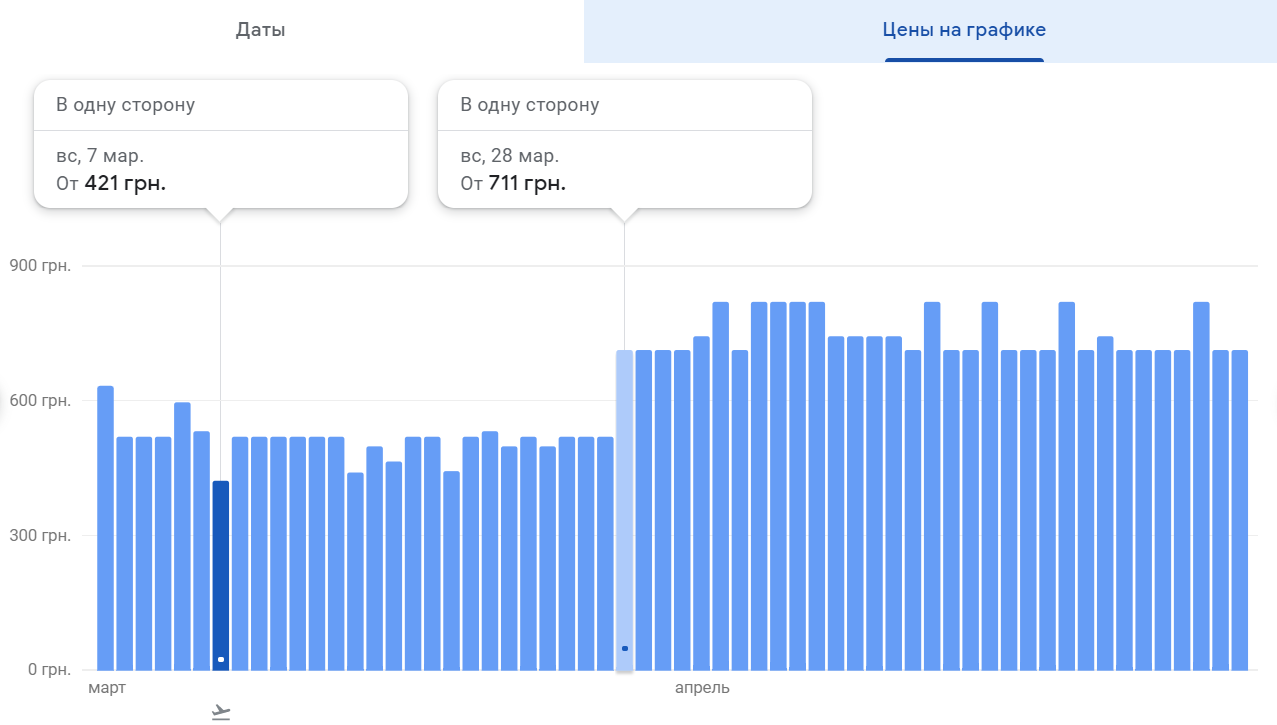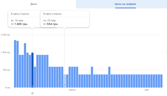 Наприклад, квиток на регулярний рейс «Київ-Одеса» можна придбати 1500 грн в один бік, якщо виліт менш ніж за два тижні, і за 550-600 грн, якщо виліт не раніше, ніж за місяць.А вже з кінця травня можна полетіти в Одесу зі Львова, Харкова та Запоріжжя за ціною від 605 грн в один бік.